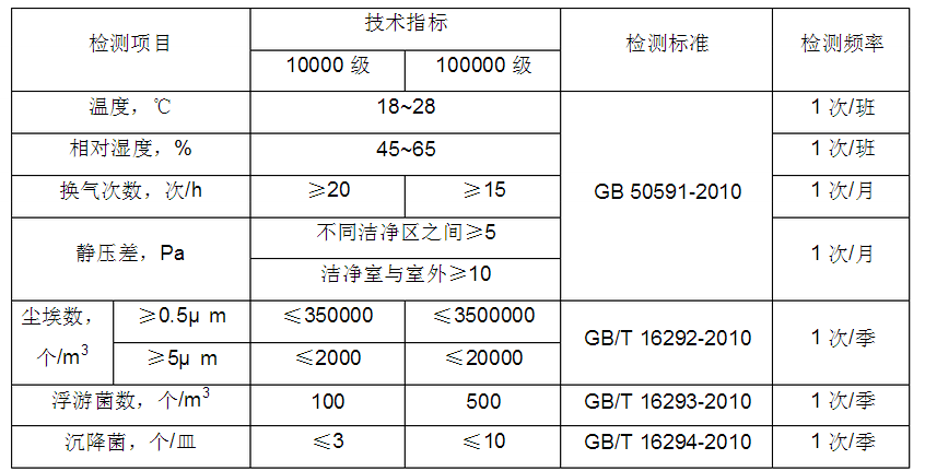 1.1 為了保證潔凈度滿足工藝需求,必須對潔凈室內(nèi)潔凈度進(jìn)行檢測。 1.2 生產(chǎn)管理員負(fù)責(zé)每班次上下午監(jiān)控記錄潔凈室溫濕度和靜壓差,并記錄。 1.3 檢測周期:檢測頻率見下表: