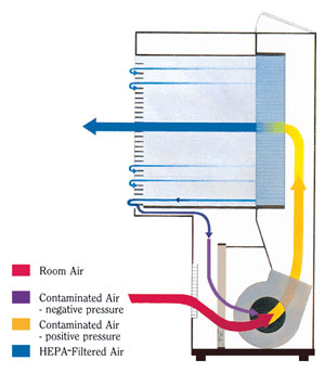 在一個水平層流潔凈工作臺,室內(nèi)空氣通過送風(fēng)機(jī)/電動機(jī)吸入到機(jī)罩的基礎(chǔ)上,通過一可清洗,可重復(fù)使用的預(yù)過濾器。引擎蓋通過HEPA過濾器的空氣推高后全會。過濾的空氣在100 FPM朝向用戶的等速橫過工作表面水平地定向。